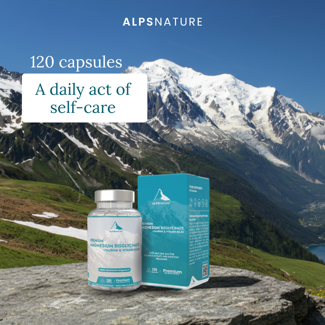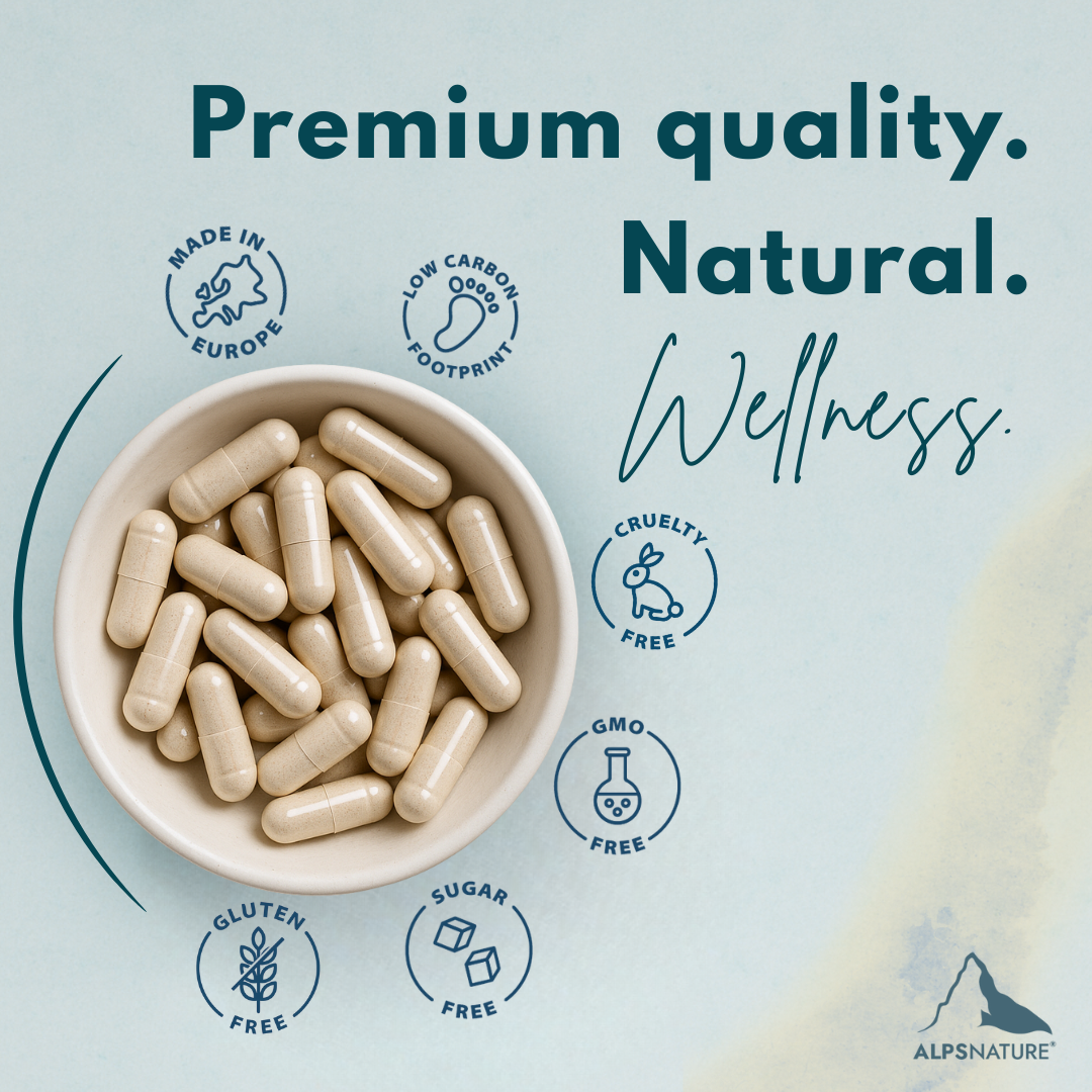 Magnesium plays a vital role in more than 300 biochemical reactions in the body. The bisglycinate form used by Alpsnature offers superior absorption and tolerance, ensuring that this essential mineral is delivered gently and effectively.